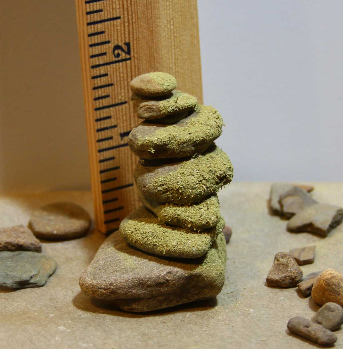 I gather the rocks from the creek here at Wild Ozark. If there’s a water feature, that’s made with a combination of hot glue gun and crayon shavings. Where a mossy look is added, it is actually powdered dried sassafras leaf or other green-colored herbs.