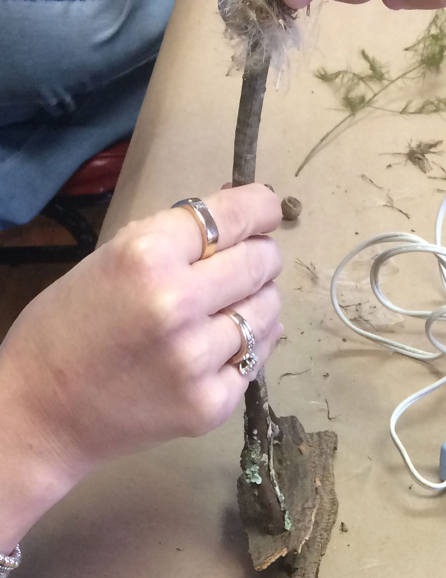 I bring everything needed, including my collection of botanicals, like acorns, twigs, moss, preserved leaves, lichens, rocks. Participants browse through it all, choosing the pieces that “speak” to them, and then get to work.