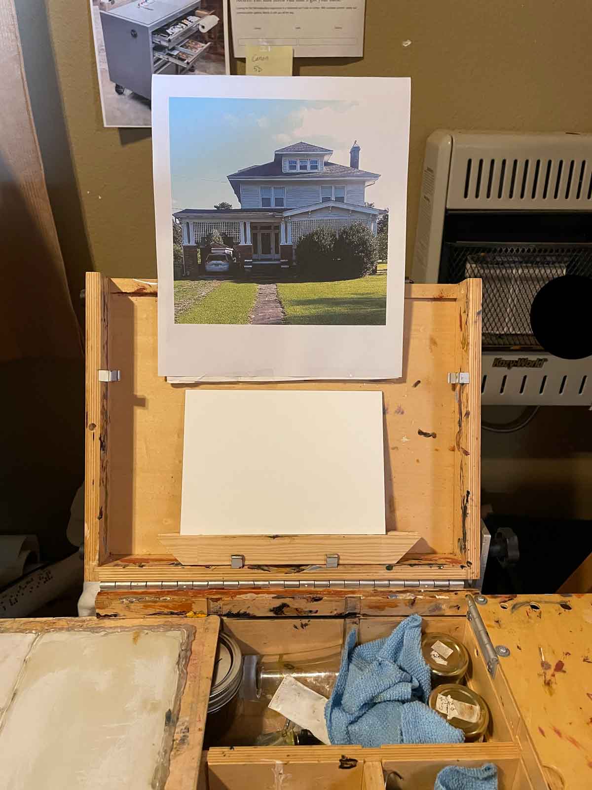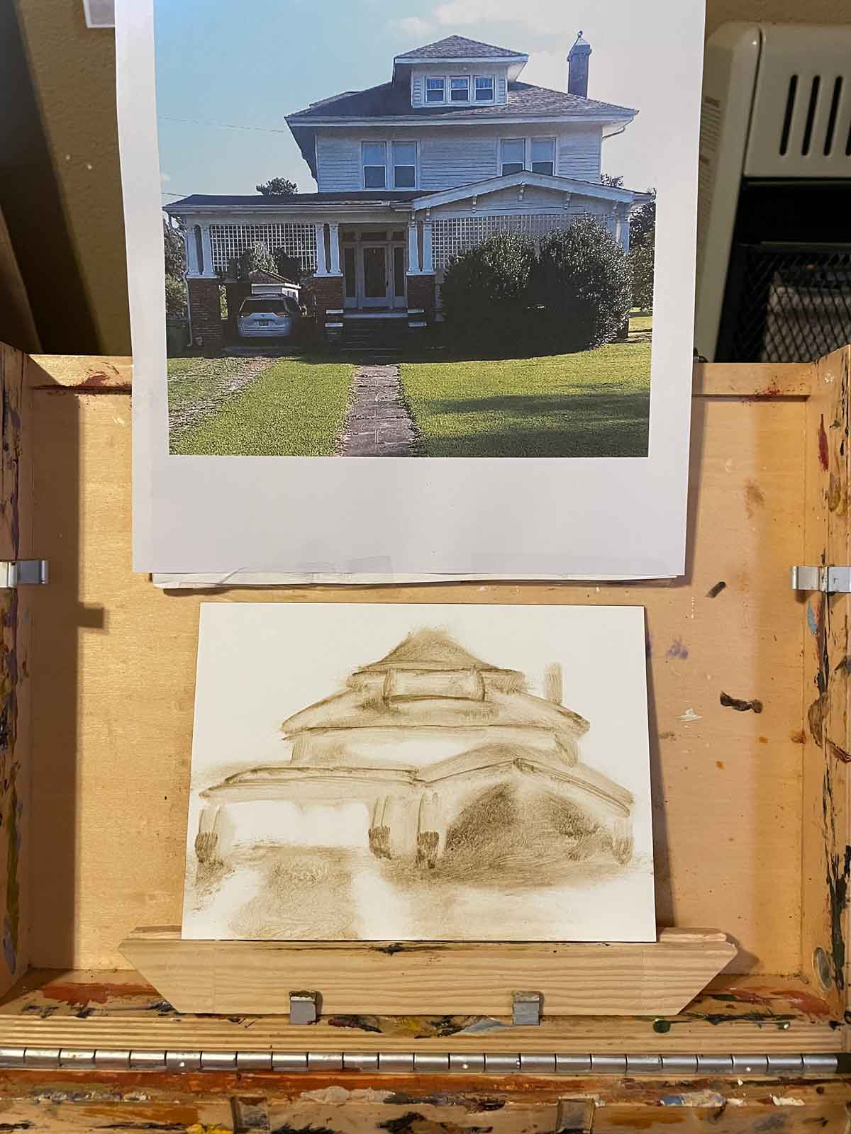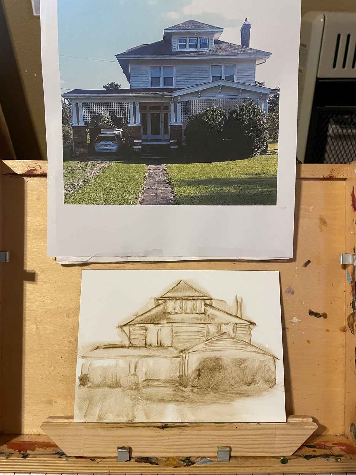 I typically don’t use rulers or pencil to make initial sketches. And so my buildings are not quite right, architecturally. But, the imperfections and the earthy pigments give them a character more fitting to my style of painting things. When I painted Dr. Carter’s Office, a building at the Shiloh Museum in Lowell, it also was imperfect. At first that bothered me, but in the end, I liked the outcome. I do try to get as close to correct as I can, though. Rather than striving for perfection in this memorial painting, I’m aiming to capture the personality of the house and the memory of the person for the recipient of the painting.
