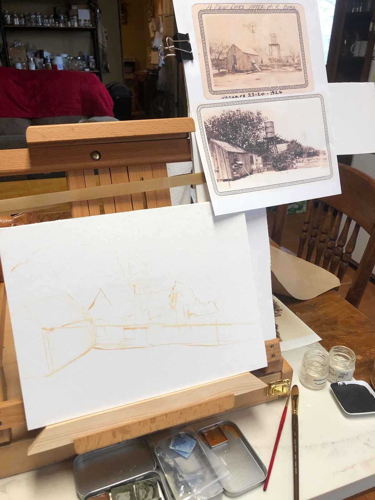 As for the color, I’m using artistic license there. I’d considered doing it sepia-toned like the photos, but then decided to add some color. It’s easy enough to tell that the house was white. Obviously, it looks like summer and the tree’s leaves will be green. I wish I had a palette of TX paints made for this painting, but the Ozark pigments are doing well enough. I’d imagine the shed looks a lot like the shed we have here, so that’s the colors I’m using for that. The sky is blue because it’s just a great opportunity to use the little bit of blue I managed to make this year. Plus, it looks pretty.